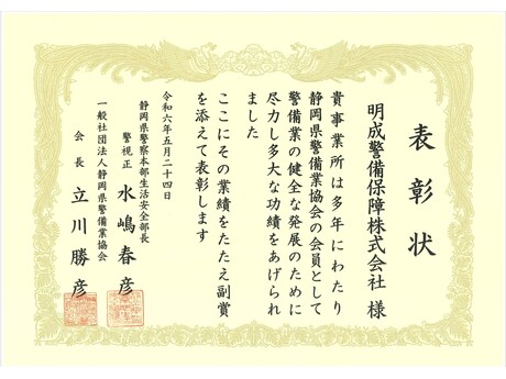 ・ 令和5年5月30日、(一社)静岡県警備業協会(加盟会社185社)の定時総会にて、当社が「令和4年度年間優秀会員表彰・最